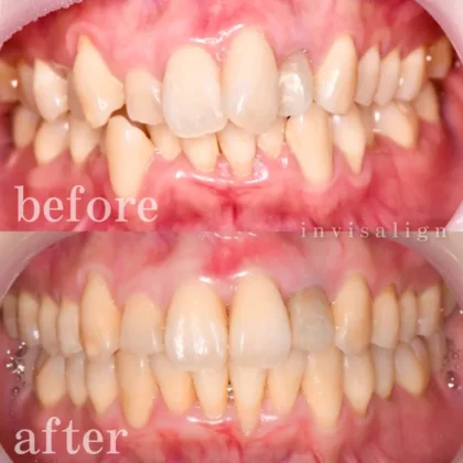 前歯のガタガタと上下の歯並びの正中のズレがあり
