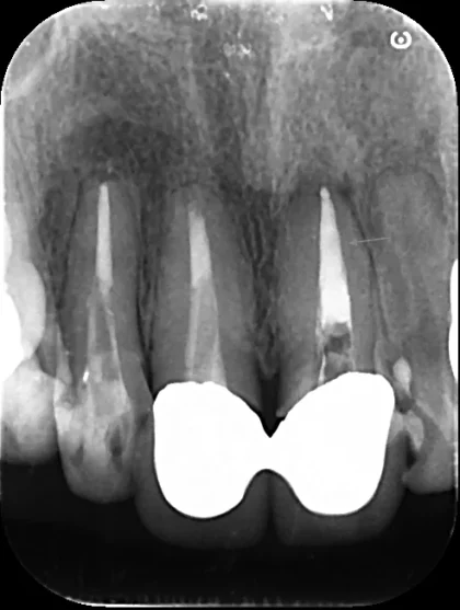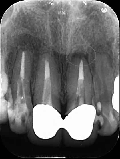 上の前歯のお痛みや腫れを主訴に来院。レントゲンを見ると、根っこに膿みがたまりお薬もきれいに入っていない状態でした。円の中の黒く写っている影が膿みです。