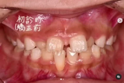 こちらの患者様も乳歯の糸切り歯が生えていて、なかなか大人の糸切り歯が出てこれない状態だったため治療計画を練り、乳歯を抜歯して切開をし大人の糸切り歯にボタンと呼ばれる突起物をつけゴム掛けをし引っ張る力で正しい位置に誘導しました。