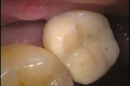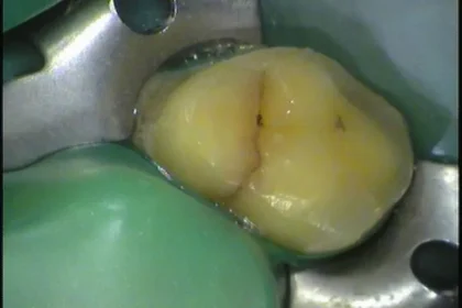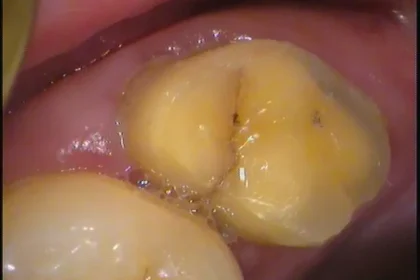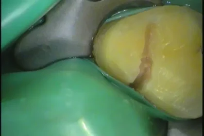 先日硬いものを噛むと痛むという患者さんのお口の中を拝見すると、左上の奥歯にヒビが入っていました。