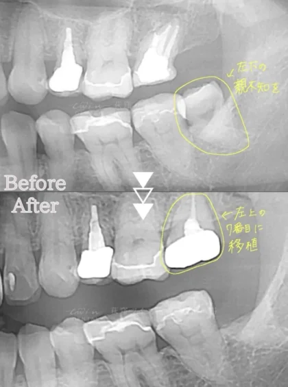 こちらの患者様は左上の歯に違和感があり診査・診断を受けた結果、左下の親知らずを使用して移植することになりました。