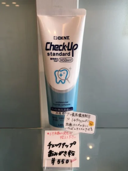 ●当院での高濃度フッ素配合のものは、チェックアップstandardという歯磨き粉をご用意しております。パッケージにも書いてあるように1450ppmフッ素が配合されています。