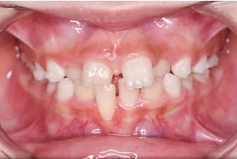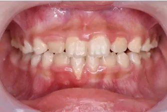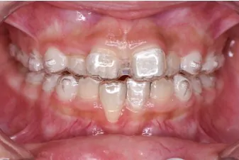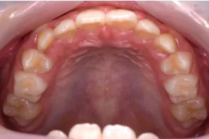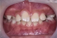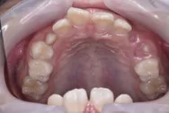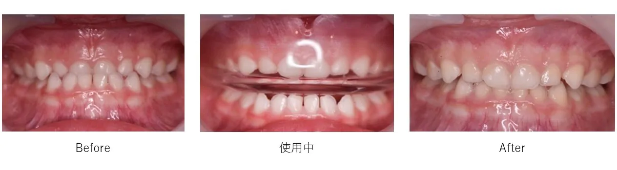 このままでは永久歯が正常に生えない為、拡大床でアーチを広げ前歯4本がしっかり生えるように矯正しました。