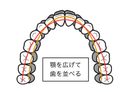 もともと歯並びのアーチが狭い方には、アーチ全体を横に広げる「側方拡大」という方法を用いることがあります。歯列を広げることで、歯がきれいに並ぶための十分なスペースを確保することができます。