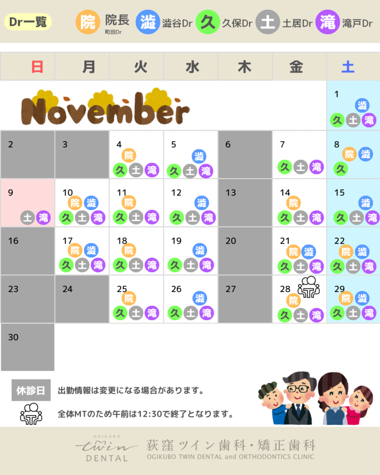 11月の診療予定(歯科医出勤カレンダー)です🍁
