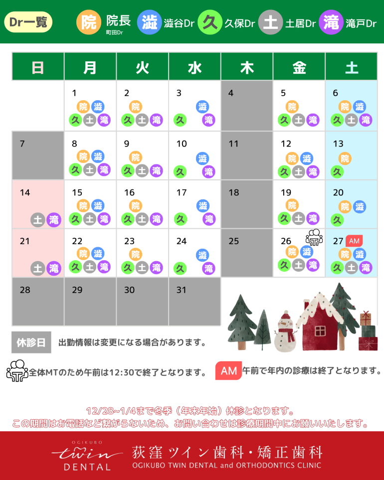 12月出勤カレンダー🎄・歯科医退職・年末年始のお知らせ